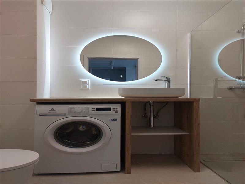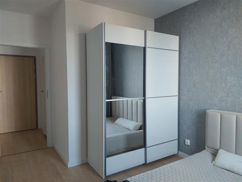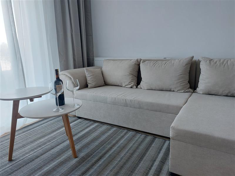 Salon wyposażony w wygodną, narożną, rozkładaną sofę. Aneks kuchenny z dużą wyspą. W wyposażeniu duża, pojemna lodówka z zamrażarką, płyta indukcyjna, piekarnik, pochłaniacz oraz zmywarka. Sypialnia z dużym łożem małżeńskim, pojemną szafą. Łazienka z kabiną prysznicową i pralką w wyposażeniu.