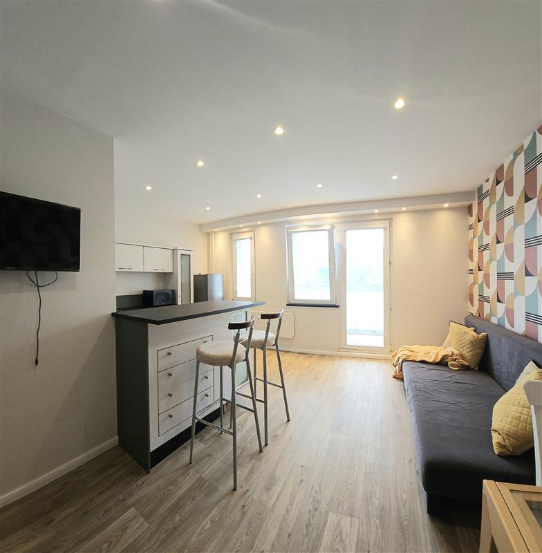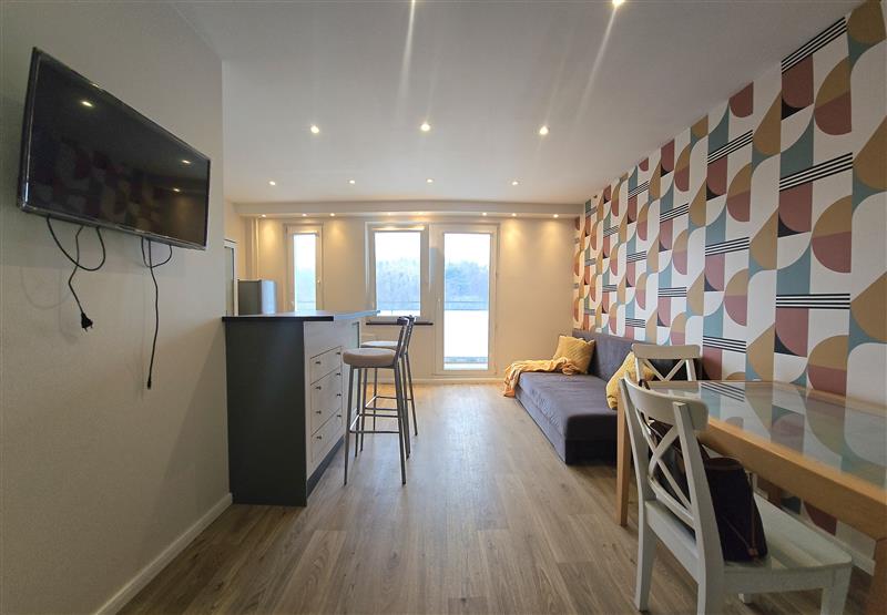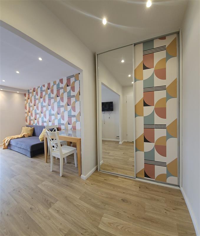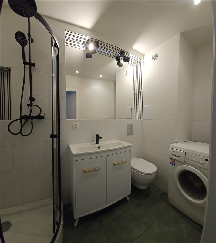 Duży pokój z sofą, stołem jadalnianym oraz telewizorem w wyposażeniu. Częściowo wydzielona kuchnia. W przedpokoju pojemna szafa w zabudowie. Łazienka z prysznicem, w wyposażeniu pralka.