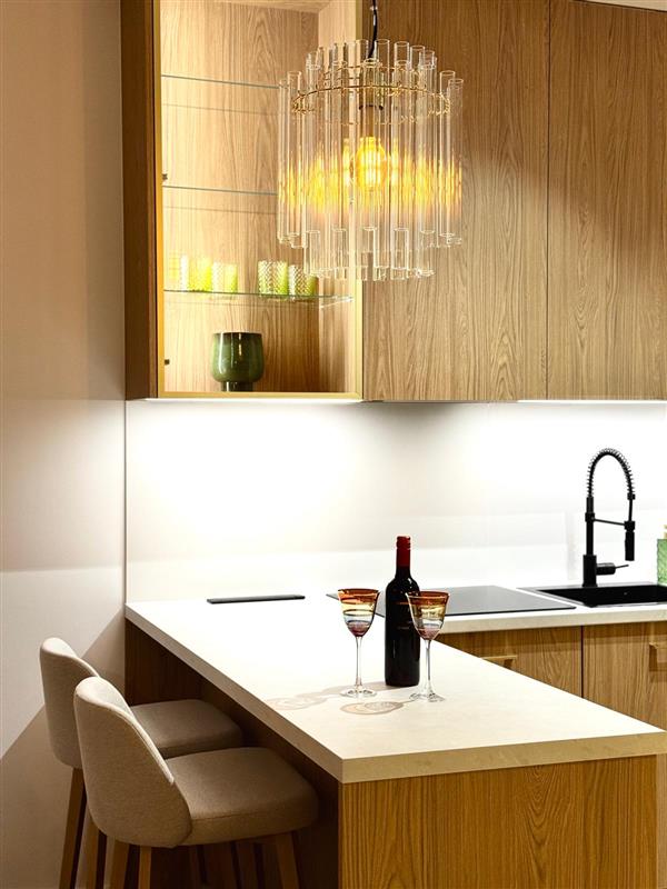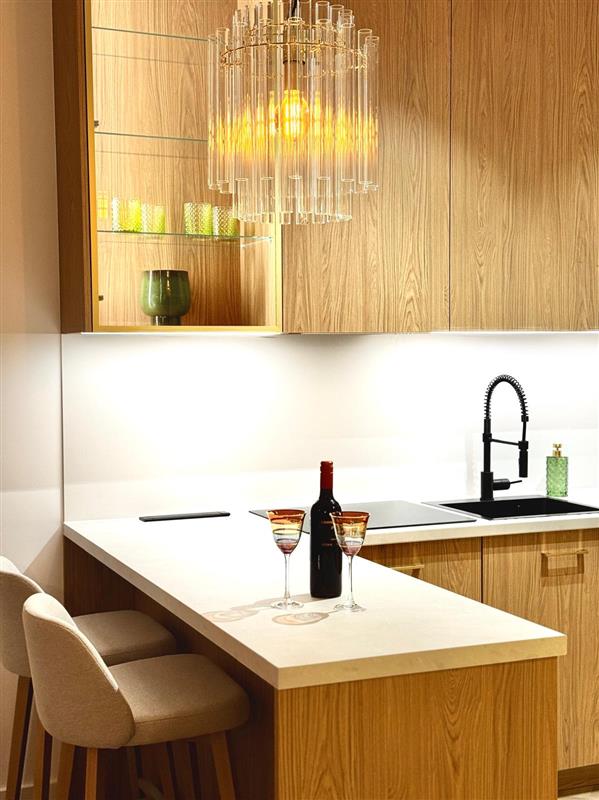 Gustownie urządzony i umeblowany w ciepłej beżowej kolorystyce z delikatnymi elementami szczotkowanego złota. Meble wykonane pod wymiar. Mieszkanie umeblowane gustownie i praktycznie z dużą ilością na przechowywanie.