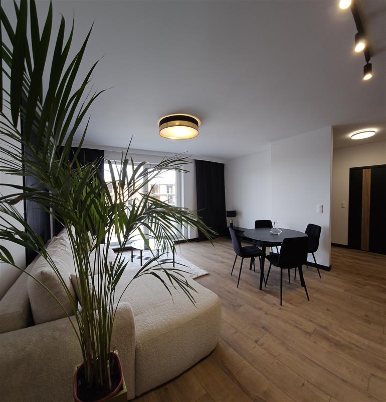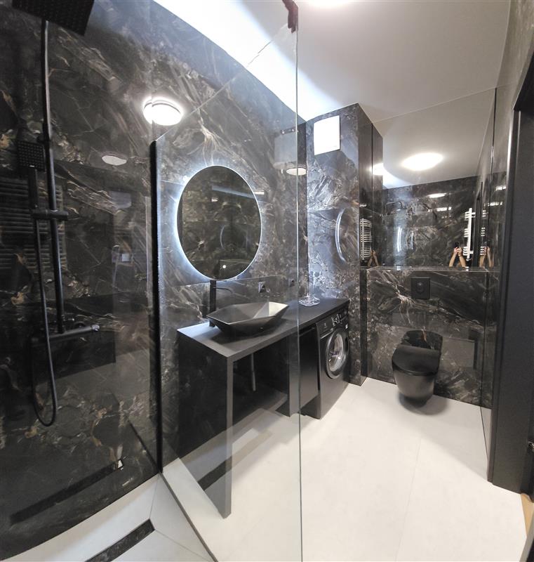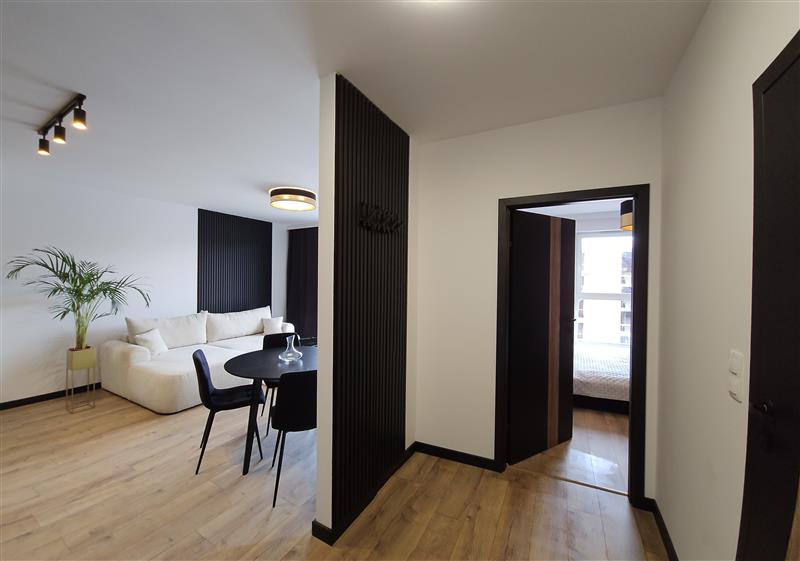 Apartament BLACK, wykończony w nowoczesnym, eleganckim stylu, pełnym czerni, połączonym z elementami złota.